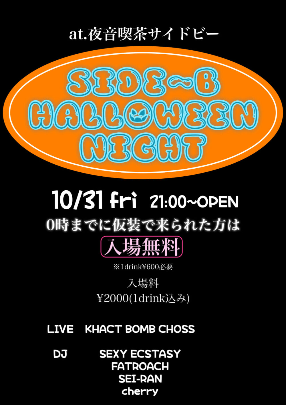 live 2025.10.21 HALLOWEEN NIGHT HALLOWEEN NIGHT2025.10.31 (FRI) @ 夜音喫茶サイドビーOPEN 21:00ENTRANCE ¥2,000(1D込み)0時までに仮装して来場の場合は入場無料 <LIVE>KHACT BOMB CHOSS <DJ>SEXY ECSTASYFAT ROACHSEI-RANcherry Tweet Share LINE Pocket ≪ NEXT PREV ≫